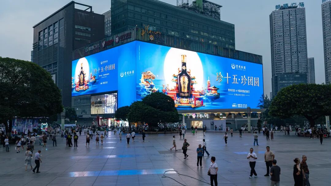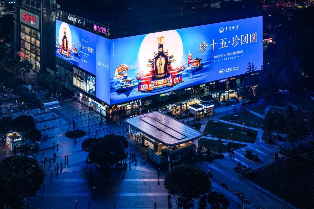 首先,在傳播戰線上,珍酒以金箔“月宮”為宣傳亮點,在9月9日先于行業打響第一槍,起手便是大手筆:一是在天津、重慶、成都、蘇州等全國近30個核心城市重點商圈,投放裸眼3D“月滿金秋珍寶宮”,疑似下凡的金箔“月宮”飛出屏幕,助力“藝術之珍”。